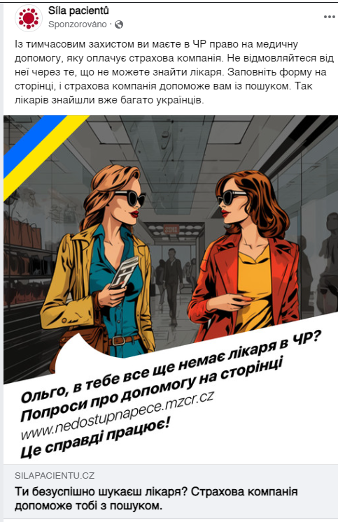 Ukrajinští uprchlíci pobývající v ČR pod dočasnou ochranou se špatně orientují v systému českého zdravotnictví. Průzkum, který jsme provedli na jaře 2023, ukázal, že v ČR platí jiná pravidla využívání zdravotní péče než na Ukrajině, uprchlíci nechápou český systém veřejného zdravotního pojištění a velkou bariérou je pro ně také jazyk. Proto jsme v lednu ve spolupráci se společností MSD spustili osvětovou kampaň na Facebooku a Instagramu, která vysvětluje základní oblasti přístupu ke zdravotní péči.